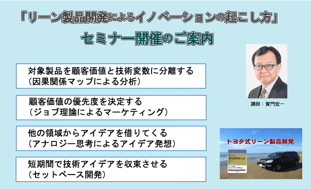 本セミナーで、イノベーションに対する基本的な考え方を見直して、まず、小さくやってみるというところに気づていただけたらと思っています。